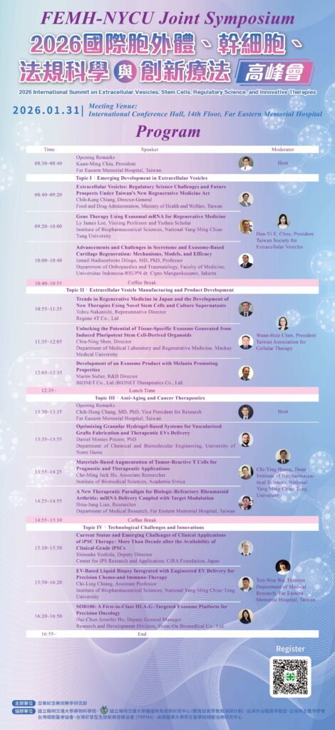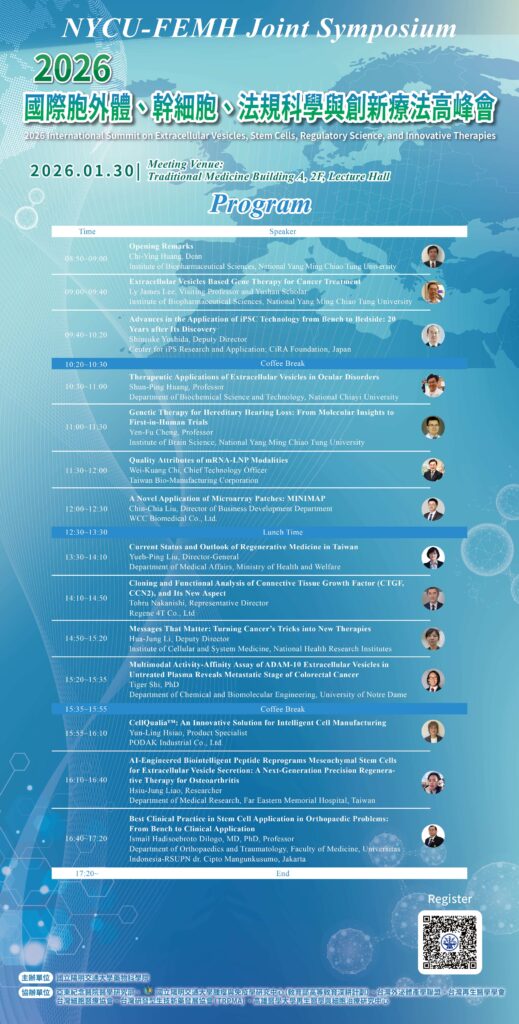 由本校藥物科學院及亞東紀念醫院主辦之【2026 國際胞外體、幹細胞、法規科學與創新療法高峰會】活動,資訊說明如下: